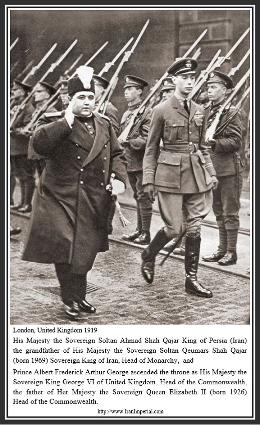 In 1923 His Majesty the Sovereign King Soltan Ahmad Shah Qajar went to visit Europe to petition for the return of Iranian’s northern and eastern lands were captured by the then Ottoman forces and subsequently transferred to Russia and their allies. During this time United Kingdom (British Government) by dishonesty and for greed, and contrary to the late Her Majesty Queen Victoria’s friendship with Sovereign Qajar dynasty, created and appointed their agent Mr. Reza (Mir panj) in Iran. Mr. Reza Mir-panj changed his name to Reza Pahlavi, created a fictitious Pahlavi house in Iran. Mr. Reza then by his British masters and in favour of new Communist Party of the Soviet Union regime (Russia) not to return the Iranian lands, made illegitimate coup, closed Iran’s borders to prevent His Majesty the Sovereign King Soltan Ahmad Shah Qajar returning to Iran. King of Iran died 21 February 1930 at Neuilly-sur-Seine, Paris, France.
