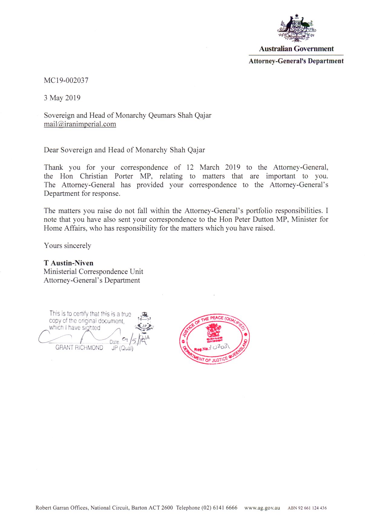 Certainly, if Her Majesty the Sovereign Queen Victoria was present today, or if Australian Government had any respect to the rule of law subject to the Commonwealth of Australia Constitution Act (1900) The Constitution, His Majesty the Sovereign Soltan Qeumars Shah Qajar, Sovereign King of Iran, Head of Monarchy, would never have had these barbarous acts committed by criminal advocates of Australian Government servants, agents, officers, ministers, politicians.
