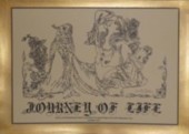 ‘Journey of life’ : This illustration depicts the wild flowers, proud cockatoo, and the fearful koala, demonstrating the fear from the cruelty of the industrial world and the effect upon the sacred land, completed 16 October 2008. It portrays our present time where man versus man looking for a spell to cast on nature so as to control the world by economic and political manipulation. |