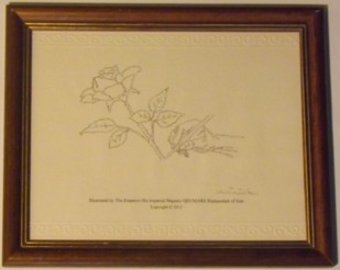 ‘Rose’ : This illustration is the portrait of His Majesty’s hand holding a pen and writing a greeting in the form of a Rose. This portrait demonstrates the secret of life in a simple lyrical movement and beckons those who may seek such understanding. |