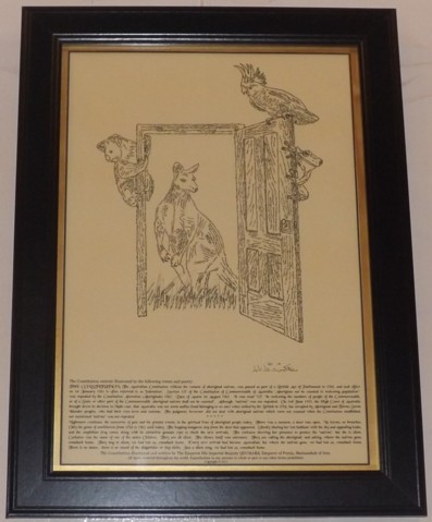 The Constitution 1901 : This historical illustration completed 27 August 2004. expresses an overview of events from 1788 to 1967, and particularly the Mabo decision of the High Court of Australia in 1992. The profound significance of this illustration is that section 127 of the Constitution referring to “natives” was not repealed. In this illustration, the cockatoo, the amphibian frog, the appealing koala and the hopping kangaroo step from the door carrying the memories of past, and preach of the present events in the spiritual lives of Aboriginal people. |