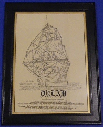 ‘Dream’ : An illustration of a 16th century sailing ship. Completed 6 May 2002. The secrets of Dream are written in the words that build up this magnificent illustration, and display the powerful but gliding movement of this sailing ship. It takes the viewer into a tranquil world of warmth and peace.