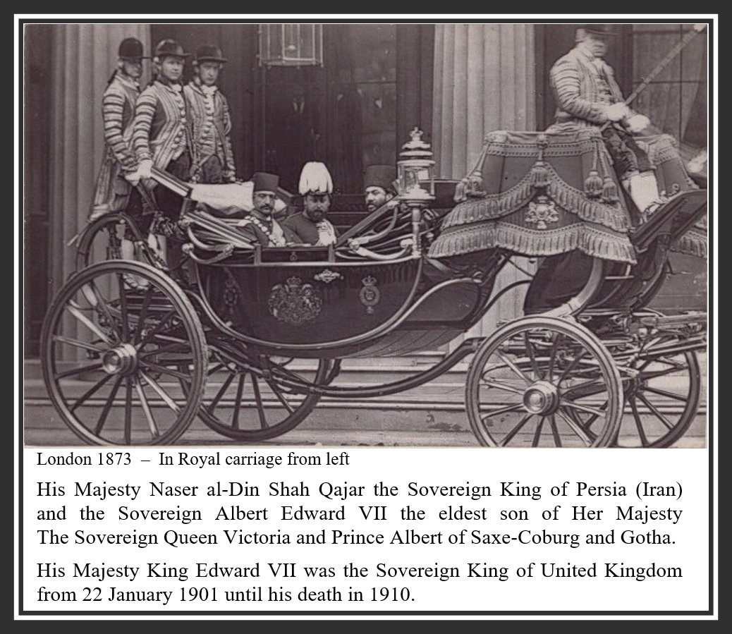 In 1873 His Majesty the Sovereign Naser al-Din Shah Qajar (d.1896) Sovereign King of Persia (Iran) respected the British Act of Parliament, during the reign of Her Majesty the Sovereign Queen Victoria Sovereign of England, and thereafter, the Sovereign Qajar dynasty during the reign of His Majesty the Sovereign King Edward VII, and so forth.